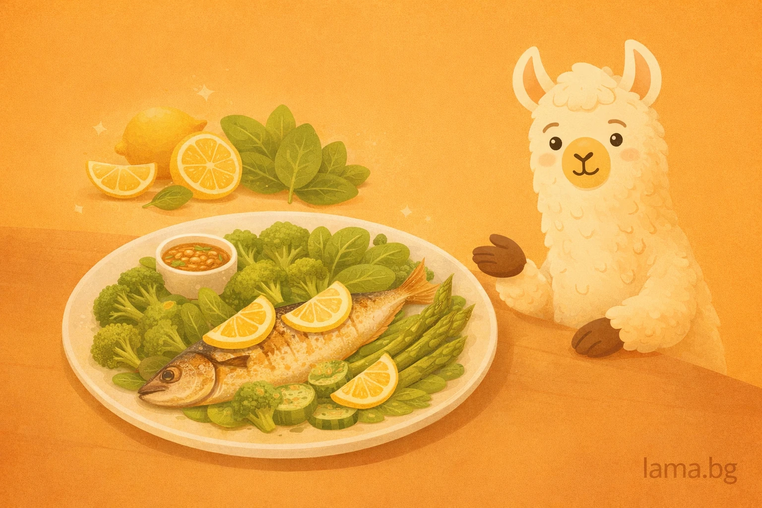 Тук рибата е в центъра на чинията, а около нея стоят зеленчуци с малко нишесте и лек ядков дресинг. Така ястието остава засищащо, без да разчита на картофи, ориз или хляб. Скумрията е по-мазна и става много добре с лимон и чесън, а пъстървата е по-лека и също се пече без усилие. Поднесена с броколи, тиквички и свежи билки, тази комбинация работи добре за балансирано основно ястие.